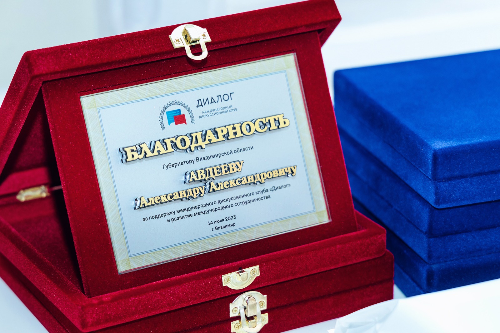 18 июля заместитель председателя Законодательного Собрания, директор владимирского филиала РАНХиГС Вячеслав Картухин вручил благодарность Губернатору Александру Авдееву «За поддержку международного дискуссионного клуба «Диалог» и развитие международного сотрудничества». Вячеслав Юрьевич является его инициатором и руководителем.