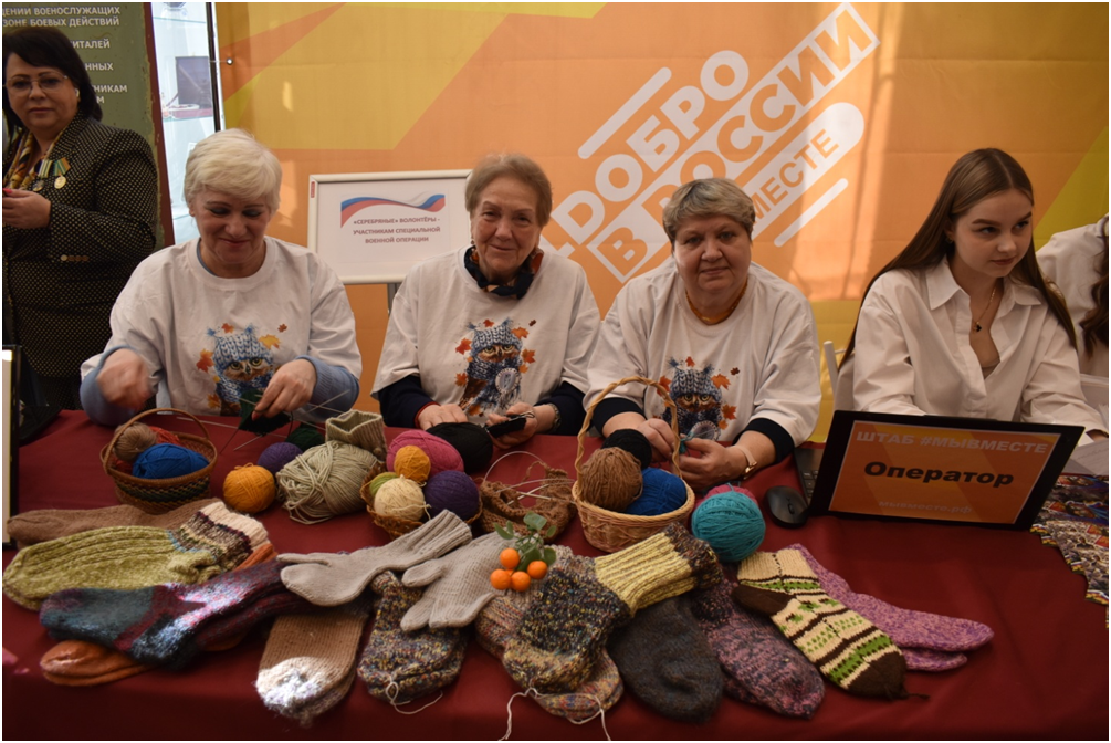 Серебряные волонтёры Владимирского комплексного центра тоже стали участниками выставки. Бабушки связали не одну сотню шерстяных носков для участников специальной военной операции.