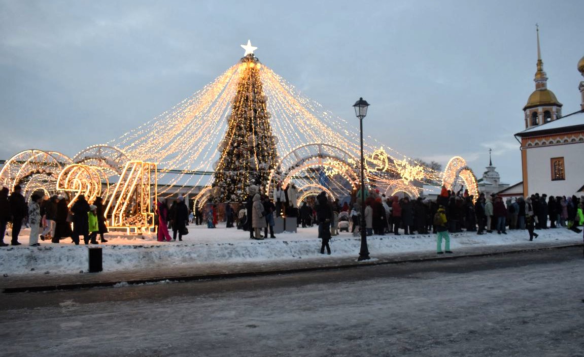 На открытие новогодних гуляний из Великого Устюга приехал Дед Мороз. После его приветственных слов зажгли главную елку на Торговой площади. Там же был открыт каток, на котором состоялась премьера ледового шоу Ирины Слуцкой «Птицы», созданного специально для новогодней столицы.