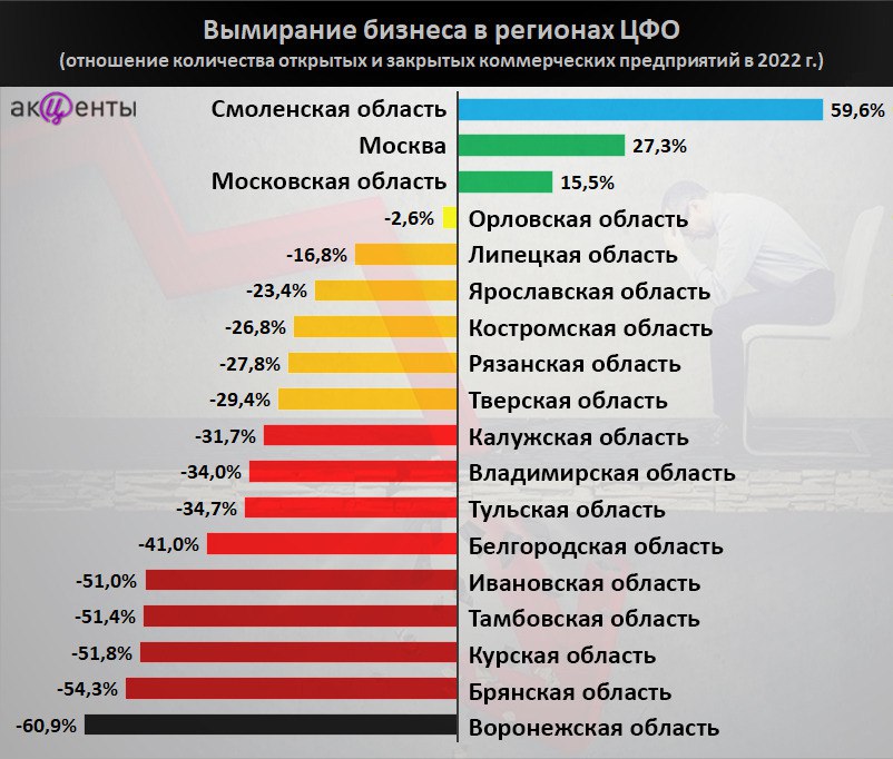 В большинстве регионов страны бизнес закрывается чаще, чем открывается. В ЦФО в минусе оказались 15 регионов.