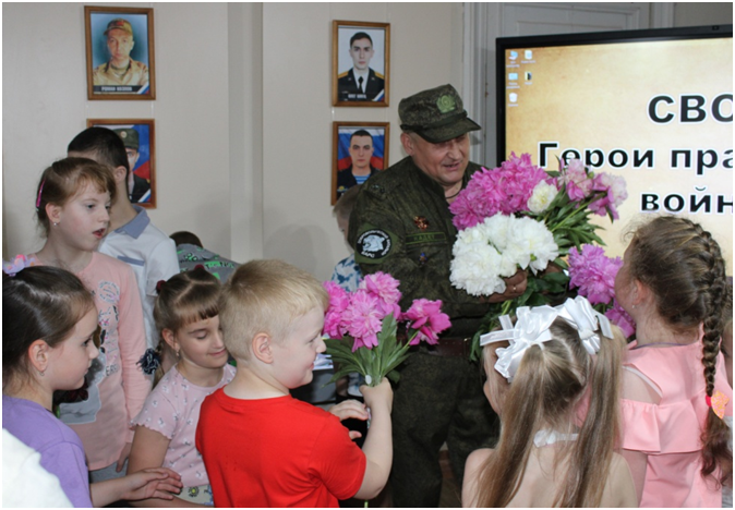 Экскурсию для ребят провел Кузьмичев Василий Вячеславович – подполковник в отставке, ветеран боевых действий, неоднократно принимавший участие в СВО. Он рассказал о бойцах, которые ценой своей жизни защищали Родину.