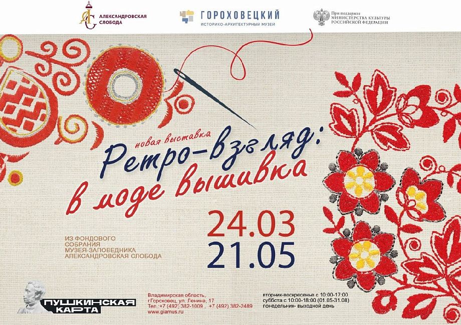 По итогам первого этапа отбора в нацпроект «Культура» определены самые значимые культурные события нашей страны, которые будут транслироваться на портале «Культура.РФ» в 2023 году. Среди них – экскурсия по выставочному проекту «Ретро-взгляд: в моде вышивка». Экскурсия откроется 24 марта в Гороховецком историко-архитектурном музее. Она станет частью юбилейного цикла к 100-летию государственного историко-архитектурного и художественного музея-заповедника «Александровская cлобода».