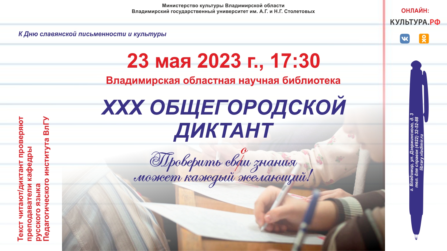 ХХХ Общегородской диктант к Дню славянской письменности и культуры состоится 23 мая 2023 г. в 17:30 во Владимирской областной научной библиотеке.