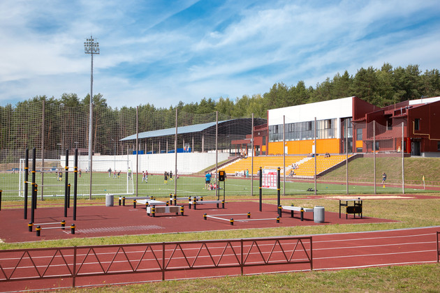Реконструированный стадион расположен на поселковой окраине, у кромки леса, вдоль речки Колпь. Спортивный объект сверкает ухоженностью и лоском. Зеленеет искусственное поле, беговые дорожки с прорезиненным покрытием, площадки для сдачи норм ГТО и скейтбординга, зона для воркаута, электронное табло, возвышаются мачты освещения, трибуны на 850 мест, а рядом – двухэтажное здание спортивного комплекса. Здесь же по соседству – универсальная всесезонная площадка, которая используется для различных соревнований и тренировок. Летом – волейбол и футбол, в зимнее время – хоккей. А ведь еще два года назад этой инфраструктуры и в помине не было.