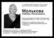 Ушла из жизни ветеран академии Молькова Любовь Николаевна