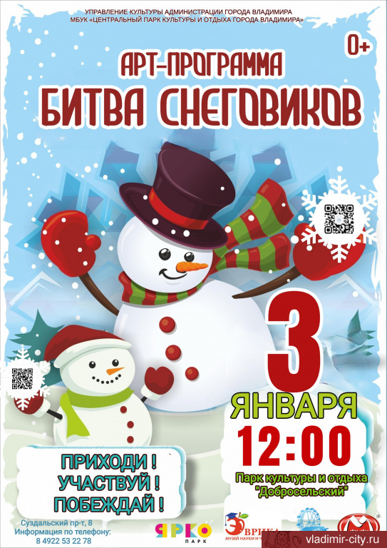 Мероприятие пройдет 3 января с 12.00 до 15.00 часов на площади рядом со скейт-парком. Ждем вас на самой доброй, яркой и снежной «Битве снеговиков – 2024»!