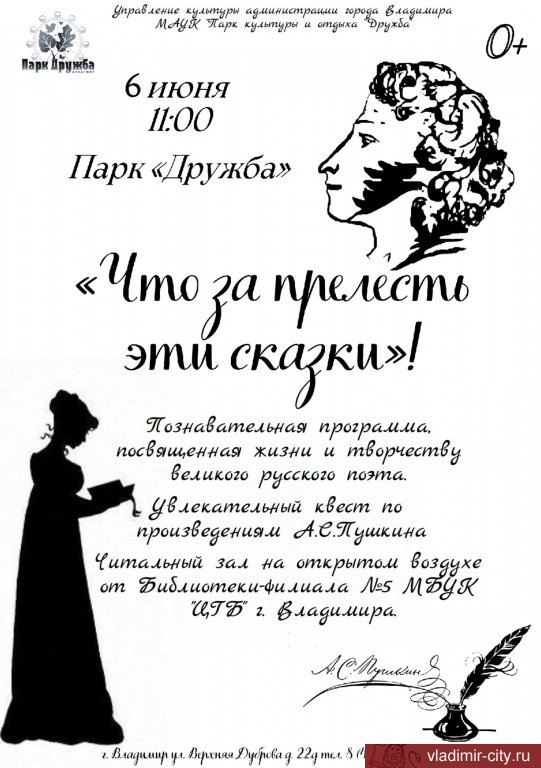 6 июня в парке культуры и отдыха «Дружба» состоится Пушкинский праздник для детей «Что за прелесть эти сказки!».