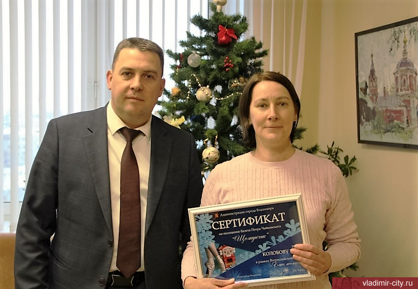 Сегодня глава города Владимира Дмитрий Наумов вручил сертификат на посещение балета «Щелкунчик» в Санкт-Петербурге маме юного владимирца Ильи Колобова.