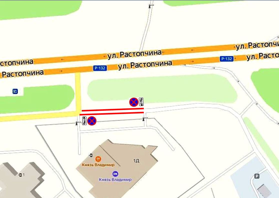 В целях обеспечения безопасности и увеличения пропускной способности по ул.Растопчина введено ограничение остановки и стоянки транспортных средств посредством установки дорожного знака 3.27 "Остановка запрещена" и 8.24 "Работает эвакуатор".