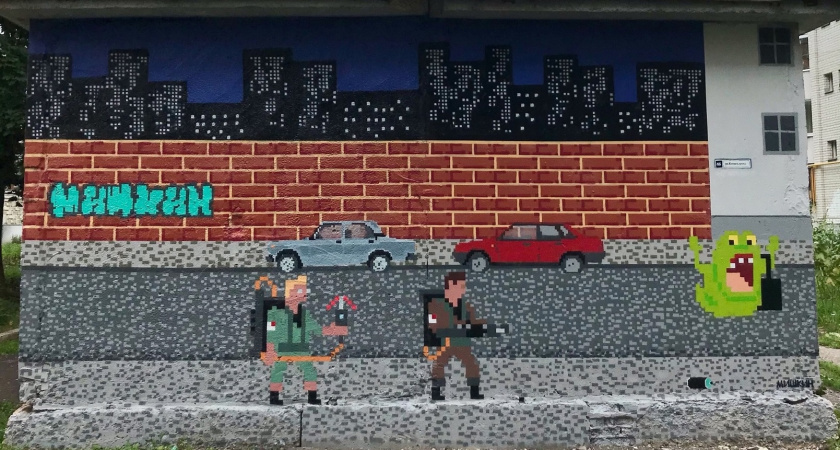 Пиксельная картина, изображающая героев культового фильма "Охотники за привидениями" в стиле пиксель-арт, пронизана самоиронией. Страх быть пойманным "охотниками" – недоброжелателями или полицией – мешает творить многим художникам его жанра.