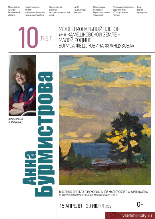 В Мемориальной мастерской Б.Ф. Французова (ул.Большая Московская, д.4-6, кв. 6) продолжается цикл небольших персональных выставок участников пленэра. В апреле-июне 2024 года свои работы показывает живописец из города Радужный Анна Бурмистрова.