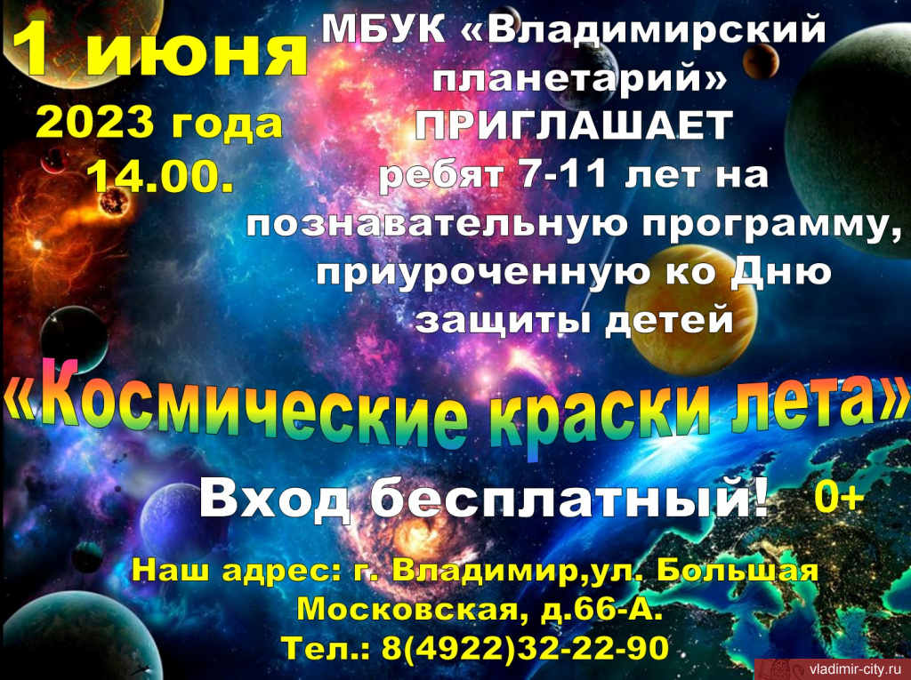 В честь Международного дня защиты детей Владимирский планетарий подготовил для маленьких посетителей 7-10 лет познавательную игровую программу «Космические краски лета». 01 июня в 14.00 юные зрители познакомятся с прекрасным миром космоса и выяснят, какие удивительные сюрпризы нам дарит Солнце. Ребята узнают про такие природные явления, как полярное сияние и кометы, выяснят какими разнообразными бывают звёзды, «познакомятся» с Солнцем и различными созвездиями. Дети будут отгадывать загадки, отвечать на вопросы о космосе, примут участие в познавательных играх и конкурсах.