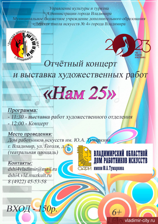 23 апреля в 12.00 во Владимирском областном Доме работников искусств им. Ю.А. Тумаркина (ул.Гоголя, д.2) состоится юбилейный отчётный концерт Детской школы искусств № 4 «Нам 25», посвящённый Году педагога и наставника.