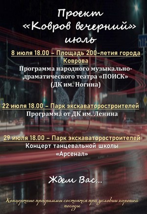 - 8 июля, площадь 200-летия г.Коврова, 18:00 ч. – программа от Народного театра «Поиск» (ДК им. Ногина).