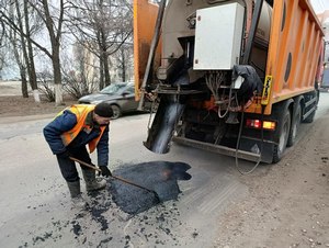 Осуществляется ямочный ремонт литым асфальтом автомобильных дорог на ул. Лопатина, ул. Брюсова, пр.Мира. Задействована бригада рабочих.