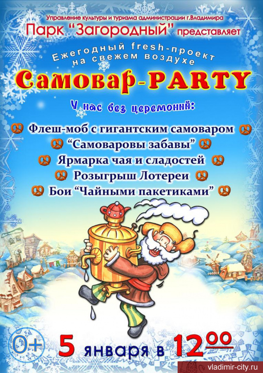 5 января в 12.00 в парке «Загородный» пройдёт ежегодный фреш-проект на морозных просторах парка, который очень любят и ждут наши гости. Праздник посвящен одному из самых древних, традиционных и неотъемлемых предметов быта русского народа — самовару. Испокон веков русский народ считается самым щедрым и открытым душой народом. Именно поэтому, целью праздника является возрождение традиций русского гостеприимства и чаепития.