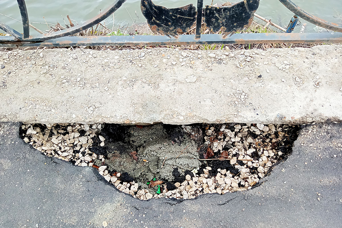 «…Если взглянуть на камни возле участка, где происходит слив воды из пруда, можно заметить трещину, которая недвусмысленно свидетельствует о деформации каменной кладки. Весной этого года часть тротуара над сливом обрушилась. Потом зияющую дыру закидали щебнем, а за две недели до сентябрьских выборов там появилась заплатка нового асфальта. Вроде бы всё хорошо завершилось. Если бы не одно «но». Я видела, как проводили ремонт каменной кладки у нас во дворе, как возводили дополнительную стену из бетона, сколько усилий и времени потребовалось на эту работу. Здесь я этого не видела. Были ли здесь проведены серьезные работы или просто дыру с ослабленными оползнем стенками засыпали щебенкой? Была ли проблема действительно решена или только временно замаскирована?» — написала наш корреспондент.