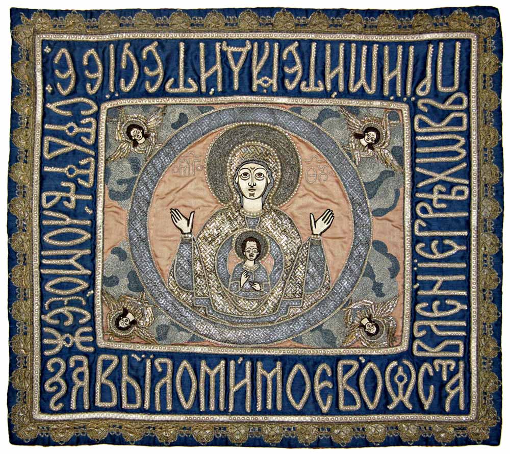 И, в-третьих, музейные коллекции обладают прекрасными образцами декоративно-прикладного искусства, отражающими тематику особенного для верующих дня. Эти культовые предметы были изготовлены первоклассными мастерами, они представляют большую художественную ценность и в настоящее время являются раритетами. Один из них – покровец «Богоматерь Знамение», редкий образцец лицевого шитья ХVII в. Не так давно он вернулся из реставрации, которую провела И.В. Пахомова, штатный специалист музея.