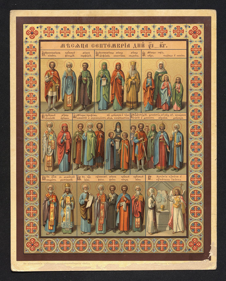 В подборке за сентябрь содержится и иллюстрация к отмечаемому сегодня, 30 сентября, празднику Веры, Надежды, Любови и матери их Софии. Праздник был установлен церковью как почитание мучениц, трагически закончивших свои жизни, но не отрекшихся от христианской веры. Во II веке по приказу императора Адриана в Риме на глазах Софии ее дочери Вера, Надежда и Любовь за отказ принести жертву языческим богам были казнены самым жестоким образом.