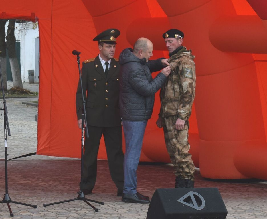 Сергей Блинов и Анатолий Трофимов вручают награду участнику СВО Павлу Василюку