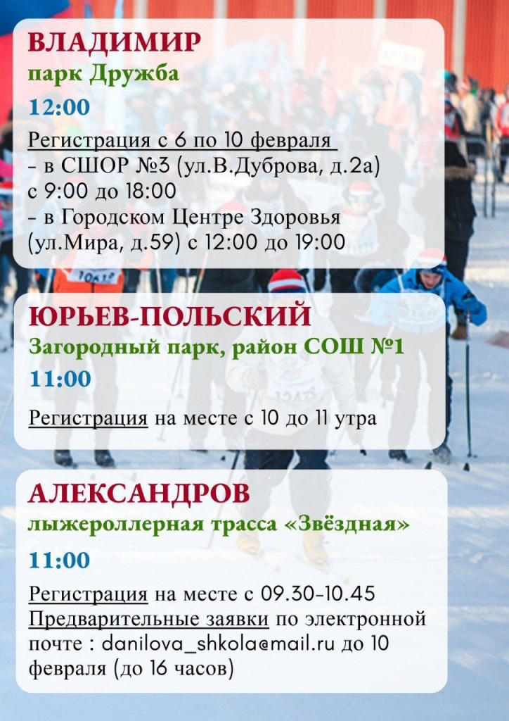 11 февраля в парке «Дружба» города Владимира пройдет 41-я Всероссийская массовая лыжная гонка «Лыжня России» на дистанциях 1 км, 5 км и 10 км. О местах и способах регистрации рассказывали здесь .