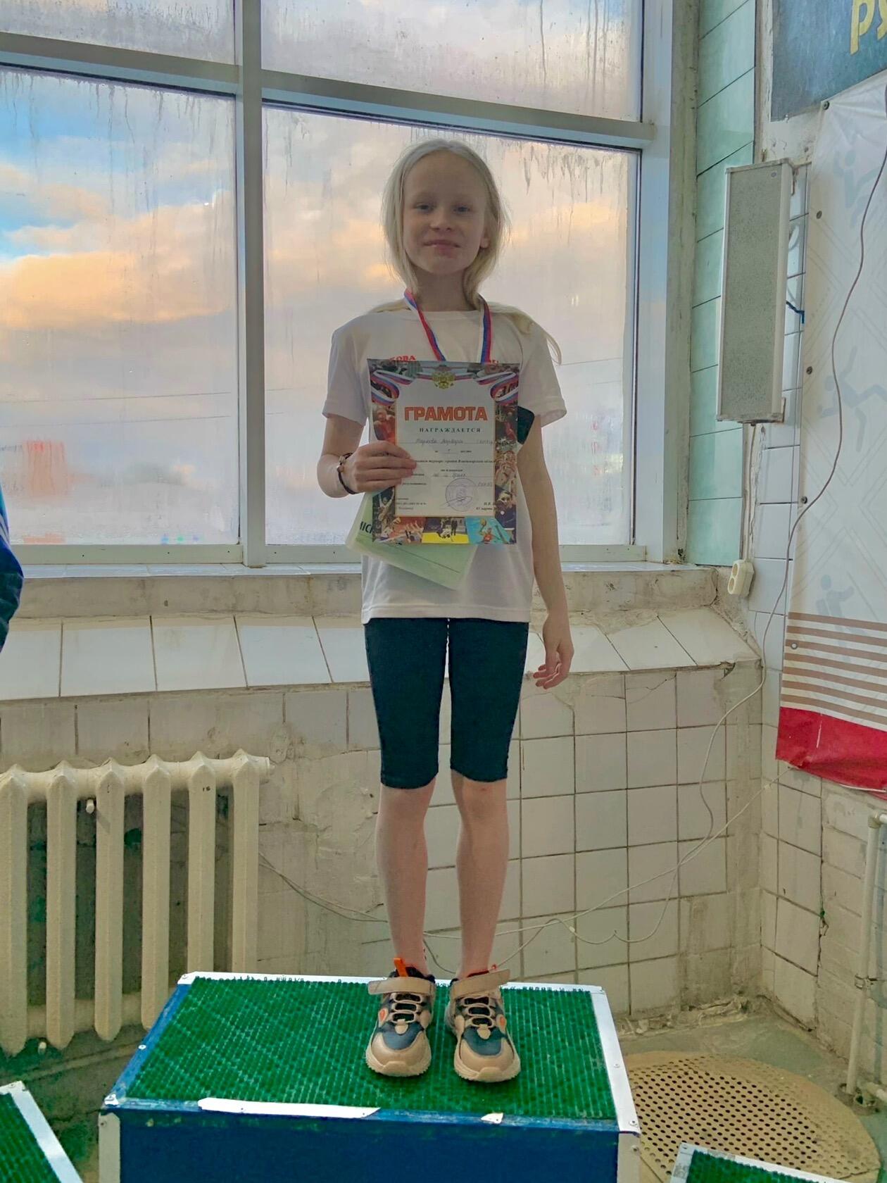 2 место Клевцова Ольга в категории 2010 г.р., на дистанции 100 м кроль на спине;