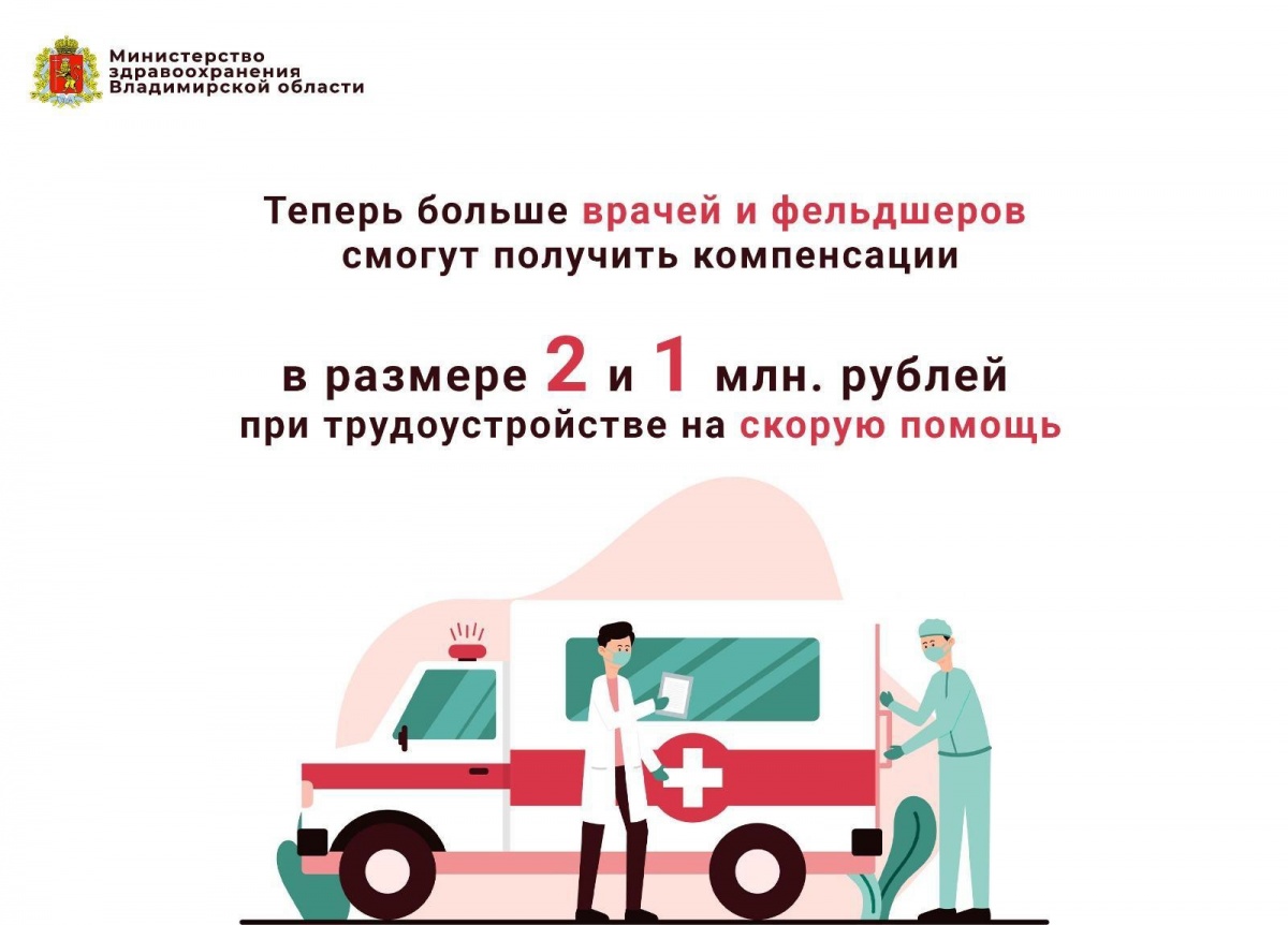 Напомним, что с 2021 года, согласно Постановлению Губернатора Владимирской области, медицинские работники общепрофильных выездных бригад скорой медицинской помощи при трудоустройстве в государственные медицинские организации городских населенных пунктов Владимирской области с населением свыше 50 тысяч человек получали единовременную компенсацию в размере 1 млн. и 2 млн. рублей [фельдшеры и врачи, соответственно].