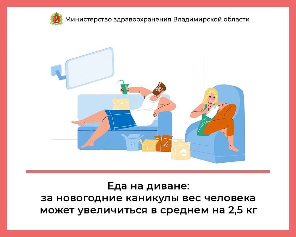 Еда на диване: за новогодние каникулы вес человека может увеличиться в среднем на 2,5 килограмма Об этом рассказала руководитель лаборатории изучения и коррекции пищевого поведения НМИЦ терапии и профилактической медици
