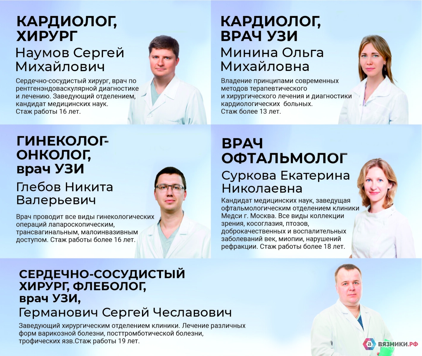 Хирургическое лечение косоглазия, птозов, доброкачественных и воспалительных заболеваний век и конъюнктивы Диагностика и лечение воспалительных и невоспалительных Диагностика и коррекция нарушений рефракции Диагностика и лечение прогрессирующей миопии Диагностика и лазерное лечение дистрофических изменений сетчатки Лечение дакриоциститов новорожденных и стенозов слезно-носовых путейВыделить: АДРЕС КЛИНИКИ: г. Вязники, ул. Советская, 68