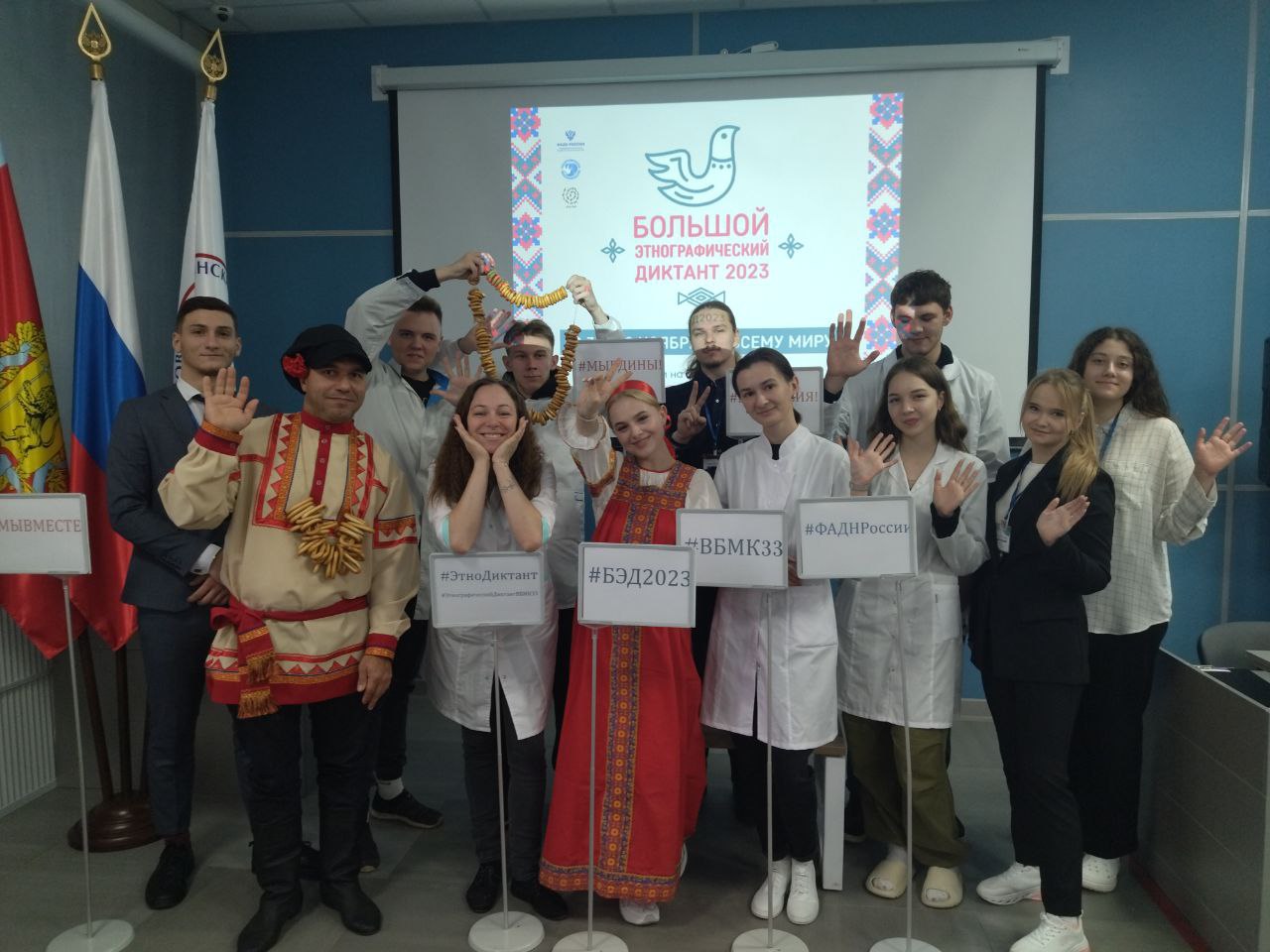 В этом году, 8 ноября 2023 года на базе Владимирского базового медицинского колледжа впервые была организована площадка Международной просветительской акции «Большой этнографический диктант». В написании Диктанта, в офлайн формате, приняли участие - 102 человека, возрастная категория участников составила от 18 до 42 лет, средний балл участников акции - 63.