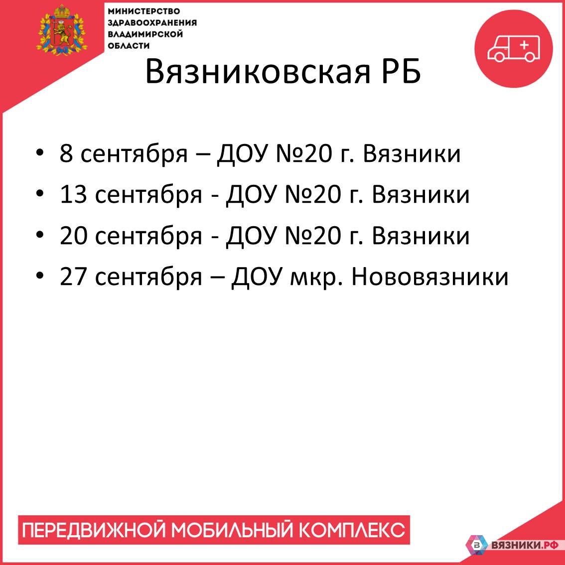 Составлен график таких поездок. Он согласован с местным управлением образования. Так, 8, 13 и 20 сентября медики будут работать в детском саде №20 города Вязники. 27 сентября мобильный комплекс прибудет в детсад микрорайона Нововязники.