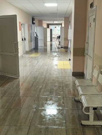 Девушка из регистратуры никого не пускала, говорила, что поликлинику затопило, никто не принимает. Только уколы и анализы, войти можно только через пожарный выход. Сдал кровь. Поднялся ради интереса и на второй этаж. Второй этаж весь затоплен. На первом видео видно, что там буквально душ был у входа (капли капают по лужам). Дождь ночью был, но не такой сильный, чтобы было столько воды. Люди сказали, что трубы прорвало. Вероятнее всего, на втором этаже.